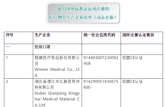 醫(yī)保商會推出取得國外標(biāo)準(zhǔn)認(rèn)證或注冊的醫(yī)療物資和非醫(yī)用口罩生產(chǎn)企業(yè)清單
