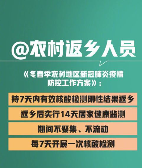 1月20日,國(guó)家衛(wèi)生健康委發(fā)布了《關(guān)于印發(fā)冬春季農(nóng)村地區(qū)新冠肺炎疫情防控工作方案的通知》,提出返鄉(xiāng)人員需持7天內(nèi)有效新冠病毒核酸檢測(cè)陰性結(jié)果返鄉(xiāng),返鄉(xiāng)后實(shí)行...